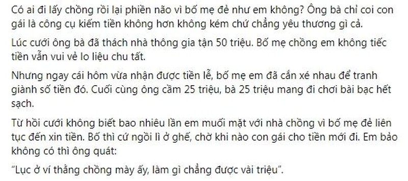 Từ hồi cưới không biết bao nhiêu lần em muối mặt với nhà chồng vì bố mẹ đẻ liên tục đến xin tiền. Bố thì cứ ngồi lì ở ghế, chờ khi nào con gái cho tiền mới đi. Em bảo không có thì ông quát: “Lục ở ví thằng chồng mày ấy, làm gì chẳng được vài triệu”.