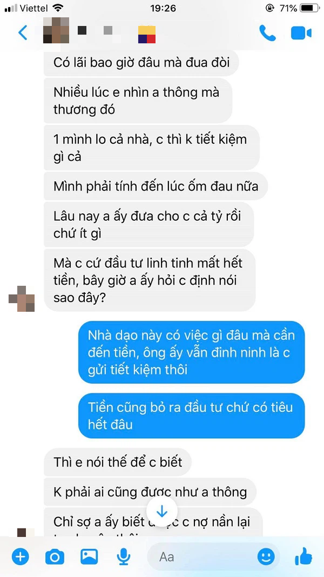 Tối nay khi vợ đi tắm, tôi mượn điện thoại cô ấy để gọi cho bố mẹ ở quê vì điện thoại của tôi vừa hết tiền. Nói chuyện xong thì có tin nhắn đến, tôi kiểm tra rồi vô tình thấy đoạn hội thoại giữa vợ và em gái. Số tiền tôi đi làm 2 năm qua đều bị vợ nướng sạch vào việc đầu tư chứng khoán, bây giờ cô ấy còn nợ nần cả trăm triệu vì mua sắm quá tay nữa.
