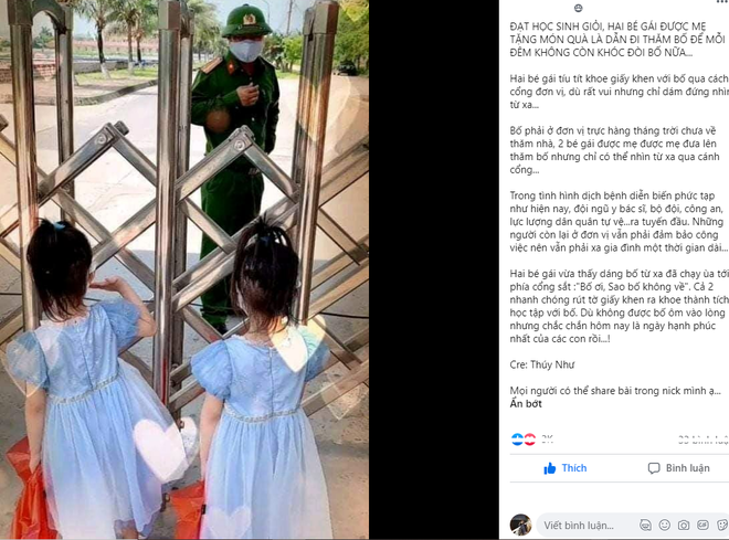"Hai bé gái vừa thấy bóng dáng bố từ xa đã chạy ùa tới phía cổng sắt hỏi: 'Bố sao không về?', cả hai nhanh chóng rút tờ giấy khen ra khoe thành tích học tập với bố. Dù không được bố ôm vào lòng nhưng chắc hẳn hôm nay là một ngày rất hạnh phúc với các con rồi", trích từ bài đăng nick Facebook Thúy Như.