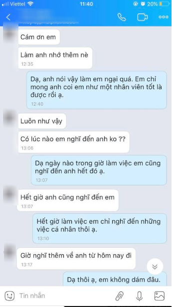 Chuyện là mình có ứng tuyển làm sale tại công ty này nhưng trong quá trình phỏng vấn thì CEO và Giám đốc thuyết phục mình làm vị trí Thư kí tạm thời trong 2 tháng thử việc để học hỏi và tìm hiểu về văn hóa công ty (với mức lương 7,5 triệu). Thấy môi trường làm việc chuyên nghiệp nên mình đồng ý là đi làm. Sếp mình thì trao đổi công việc qua Zalo và thỉnh thoảng có nhắn tin hỏi thăm nhân viên (tâm trạng hôm nay của em thế nào? Hôm nay em có kế hoạch gì không ?).
