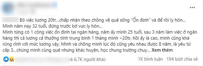 "Bỏ việc lương 20 triệu, chấp nhận theo chồng về quê sống “ổn định” và để rồi ly hôn.