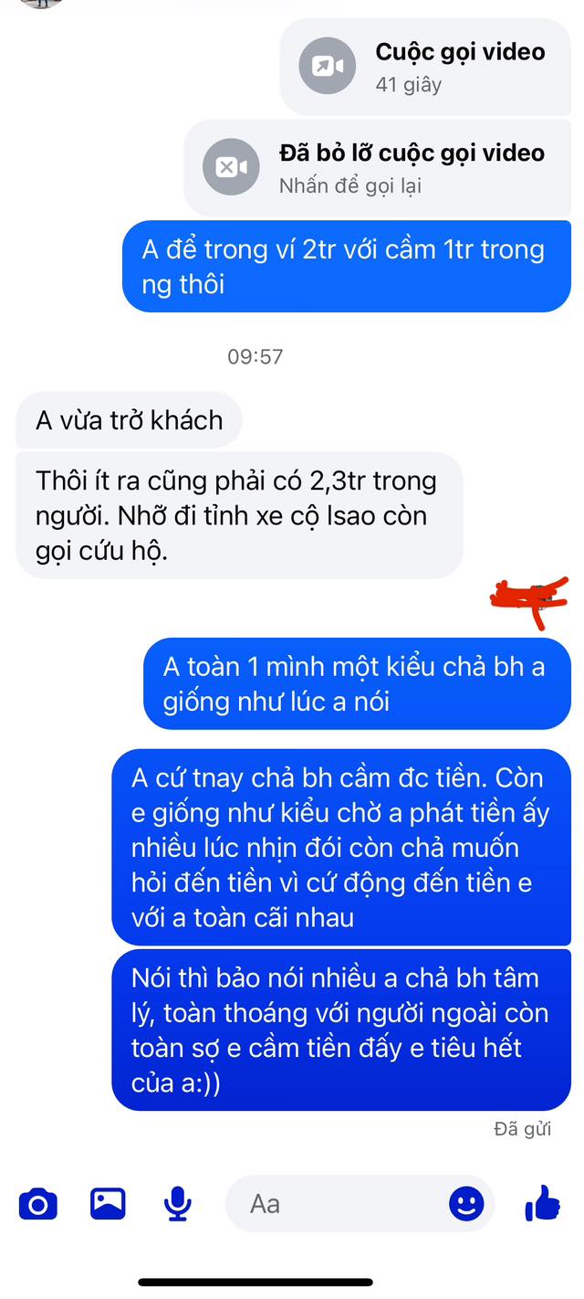 Đính kèm dòng tâm sự, là đoạn tin nhắn của 2 vợ chồng. Khi đó, vợ đề nghị chồng để trong ví 2 triệu, còn cầm thêm 1 triệu trong người thôi. Nhưng khi thấy người chồng không đồng ý, người vợ đã nhắn dòng tin nhắn dài trong sự bức xúc: