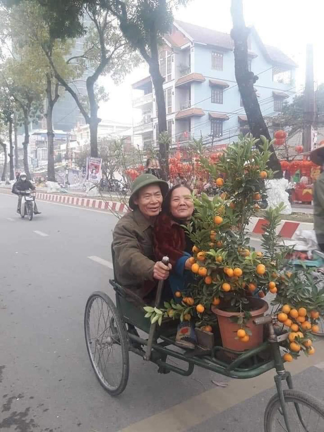 Bức ảnh ghi lại cảnh hai vợ chồng trung niên độ 50 tuổi đang đèo nhau trên một chiếc xích lô, chở theo một chậu quất trĩu quả. Trong khi bác trai cười vô cùng hạnh phúc thì bác gái cũng nép vào lòng ông xã, gương mặt vô cùng mãn nguyện, bình yên.