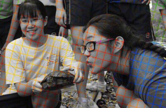 Nói cách khác, những chiếc áo màu đỏ, lam, vàng, lục... trong ảnh thực chất là do các đường kẻ màu sắc tương ứng tạo ra.
