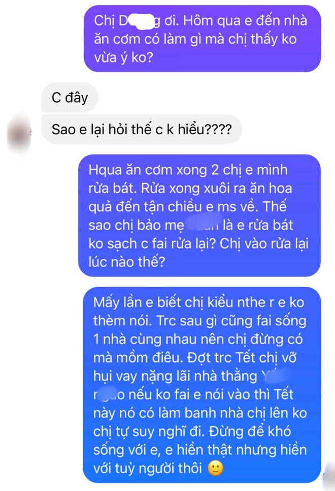 "Mấy lần em biết chị kiểu như thế rồi, em không thèm nói. Trước sau gì cũng phải sống một nhà cùng nhau nên chị đừng có mồm điêu. Đợt trước Tết, chị vay nặng lãi, nếu không phải em nói vào thì Tết này, nó có làm banh nhà chị lên không, chị nghĩ đi. Đừng để khó sống với em. Em hiền thật những hiền với tùy người thôi", cô gái nhắn tin cho chị chồng.