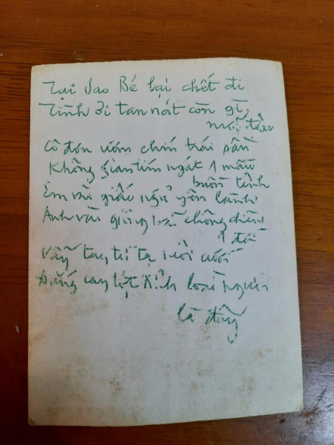 Về bài thơ tạ từ bà, ông viết ngay sau khi tang lễ được tổ chức xong xuôi. Nó chứa đựng toàn bộ sự đau đớn, tan nát của một người chồng mất vợ. Câu đầu tiên đọc lên đã cảm thấy đau đến xé lòng: "Tại sao Bé lại chết đi/Tình ơi tan nát còn gì nữa đâu".