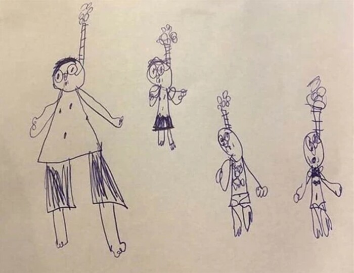 Cậu bé giải thích rằng gia đình cậu vừa đi lặn biển vào tuần trước và kỉ niệm đó chắc hẳn rất vui nên đã được cậu vẽ lại trên trang giấy. Điều này có nghĩa là cả 4 người trong bức tranh không phải bị treo cổ mà là đang lặn ở dưới biển. Vật trông giống như sợi dây ở cổ mỗi người kia chính là ống thở với những bong bóng nổi lên ở trên miệng ống.