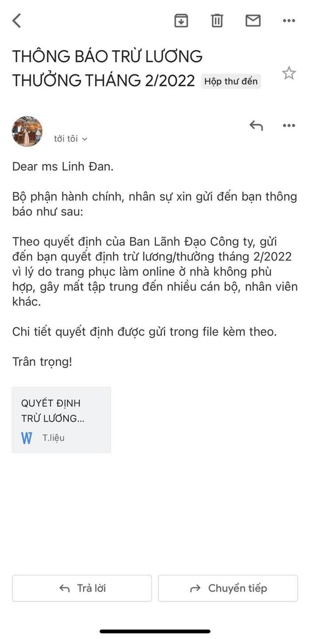 Mới đây, cộng đồng mạng đã được phen xôn xao vì bức ảnh chụp màn hình thư thông báo trừ lương của một cô gái. Trong email, nguyên nhân bị trừ lương thưởng là do "trang phục làm online ở nhà không phù hợp, gây mất tập trung đến nhiều cán bộ, nhân viên khác".