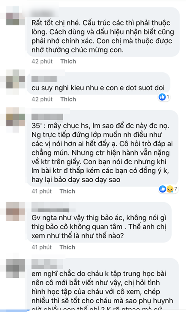 Cứ ngỡ sẽ được các bậc phụ huynh khác đồng tình nhưng ai ngờ bà mẹ này lại nhận phải cơn mưa trái chiều. Dù một số ý kiến không ủng hộ việc cô giáo bắt học sinh chép phạt nhưng hầu hết đều tán thành vì cho rằng: Cô giáo đang quan tâm và muốn học trò cải thiện thành tích học tập. Một số phụ huynh phân tích: Bé đã học lớp 5, nếu giờ còn chưa nhớ được các thì trong tiếng Anh thì đến khi lên cấp trung học sẽ rất khó theo kịp các bạn. Bên cạnh đó, có những thứ buộc phải học thuộc lòng như công thức thì khi học mới có thể áp dụng nhuần nhuyễn.