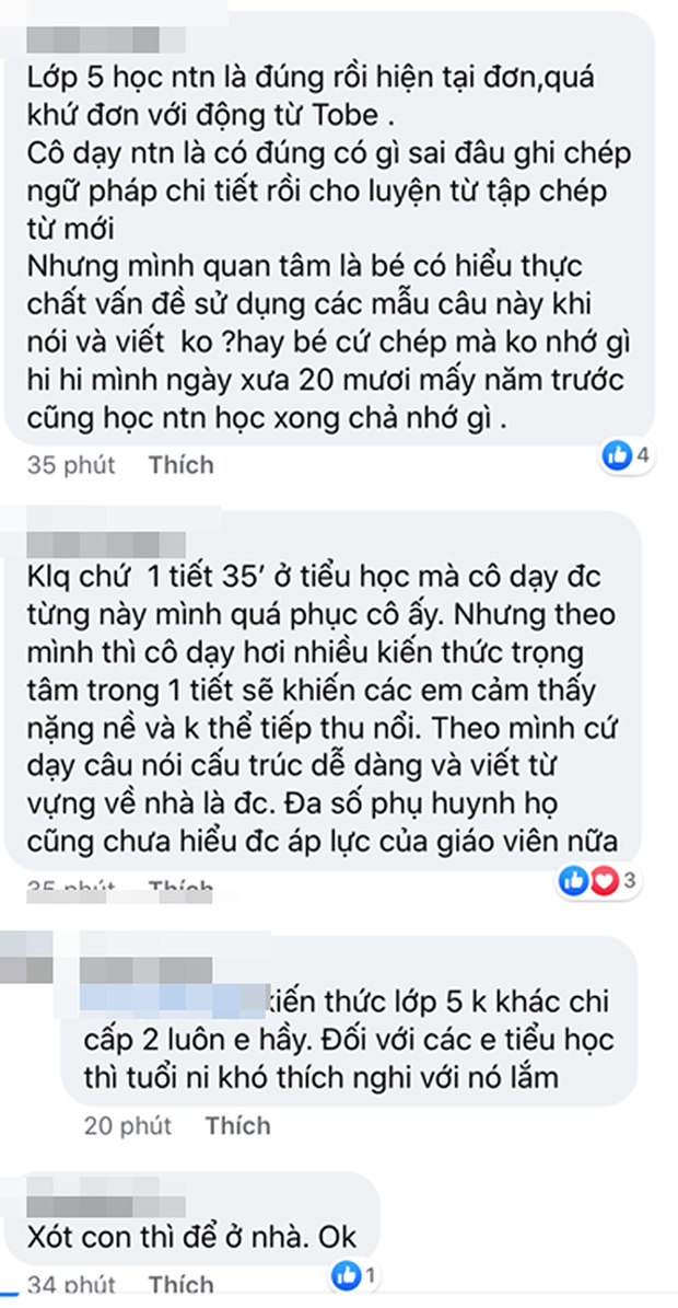 Chị B.T bày tỏ thắc mắc: "Anh văn cấp tiểu học bây giờ bắt học kiểu này sao ạ? Vì ngày xưa học cấp 3 em vẫn chưa thuộc hết, nhớ hết các thì này".
