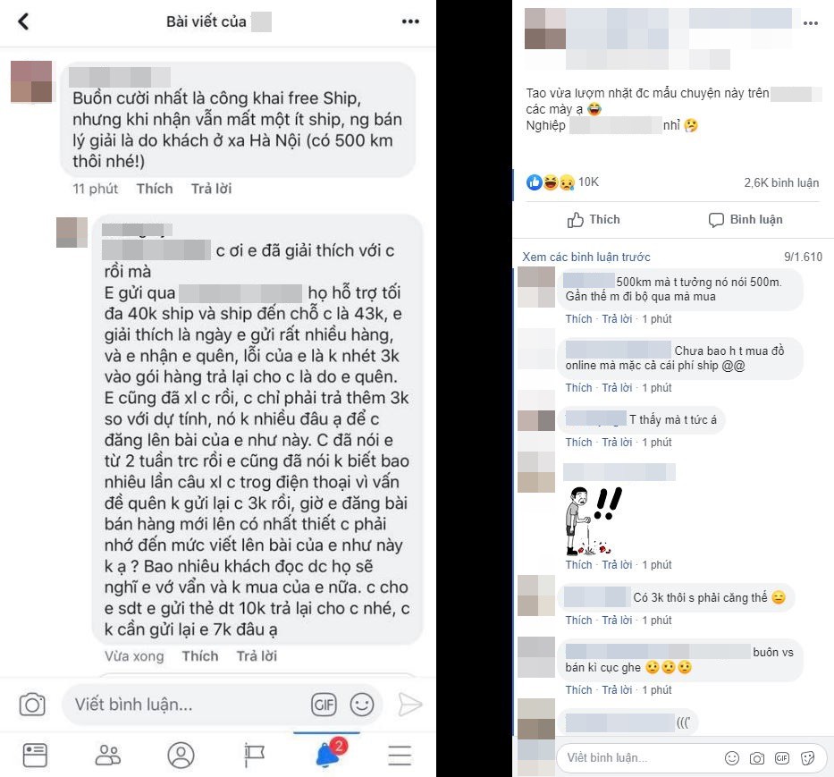 Cụ thể, phía dưới bài đăng của người bán hàng có tên T.V trong một nhóm mua bán hàng online nổi tiếng, một người khách hàng đã để lại bình luận "tố" như sau: "Buồn cười nhất là công khai freeship, nhưng khi nhận vẫn mất một ít. Người bán lý giải là do khách ở xa Hà Nội (có 500km thôi nhé!)".