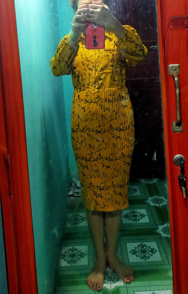 Thoạt nhìn thì sản phẩm nhận được có vẻ khá giống quảng cáo, nhưng xem kĩ mới thấy chiếc váy đã bị rách 1 đoạn khá to, mặc lên dáng không chuẩn. Dáng chân váy như mẫu sẽ ôm eo và xoè ở dưới thì váy cô gái nhận được phần đuôi váy bó vào chân, nhìn rất mất cân đối.