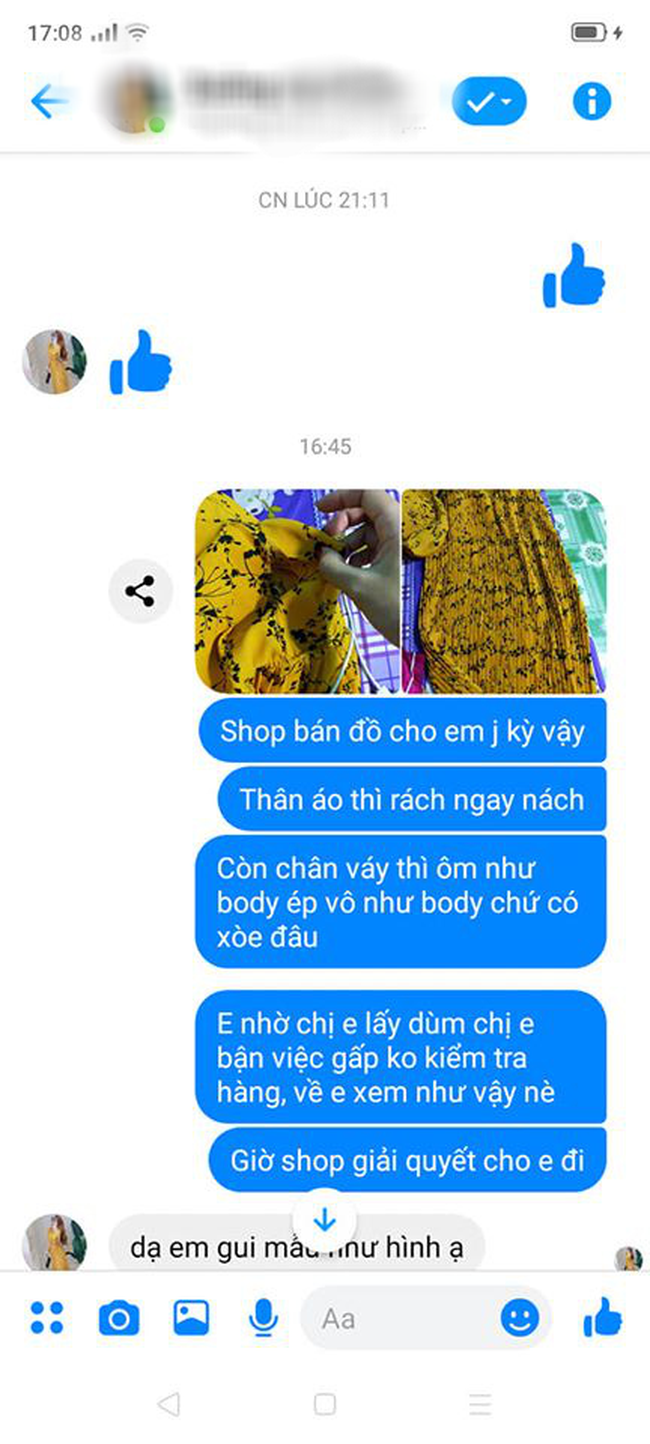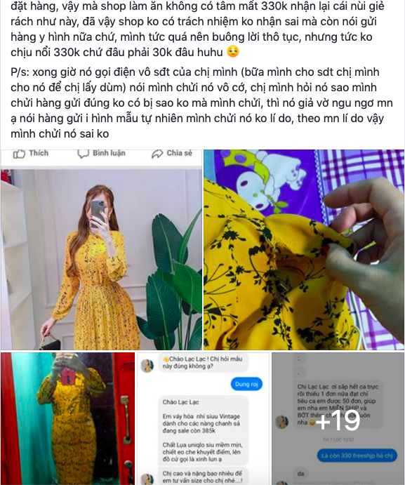 Cô nàng ấm ức tâm sự: "Tức quá mọi người ạ. Vì không có thời gian đi shop chọn đồ, thấy trên Facebook có mẫu đẹp vừa ý nên đặt hàng, vậy mà shop làm ăn không có tâm mất 330k nhận lại cái giẻ rách như này, đã vậy shop không có trách nhiệm, không nhận sai mà còn nói gửi hàng y hình nữa chứ. Mình tức quá nên buông lời thô tục, nhưng tức không chịu nổi, 330k chứ đâu phải 30k đâu.