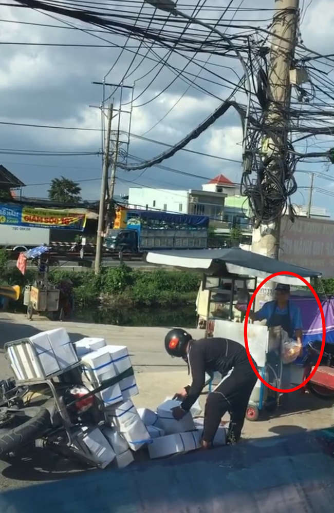Trong video có thể thấy người đi xe máy đổ hàng ra đường một mình vất vả xử lý tình huống, gỡ cả đống hàng ra mới có thể dựng chiếc xe máy lên được, cách đó không xa có một người đàn ông bán hàng rong vẫn đang mải làm việc và không quan tâm đến người đang cần giúp đỡ.