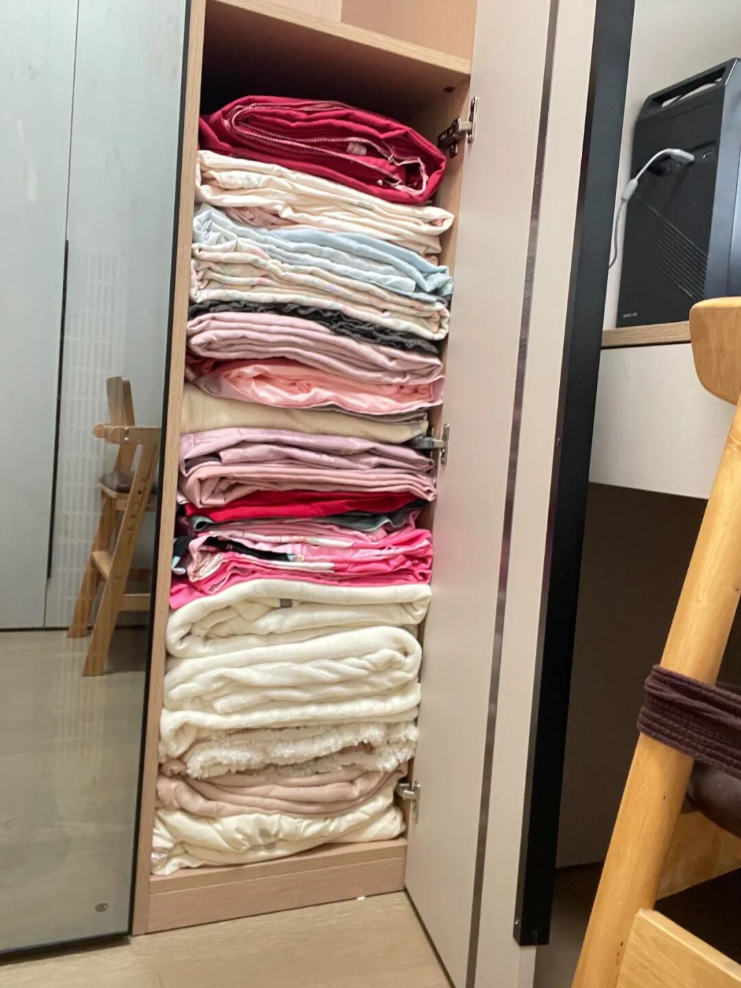 Ga, vỏ chăn, vỏ gối – những thứ tưởng đơn giản lại chiếm rất nhiều chỗ. Các cô dì không xếp chồng lên nhau như chúng ta, mà gấp gọn rồi nhét tất cả vào trong… một chiếc vỏ gối.
