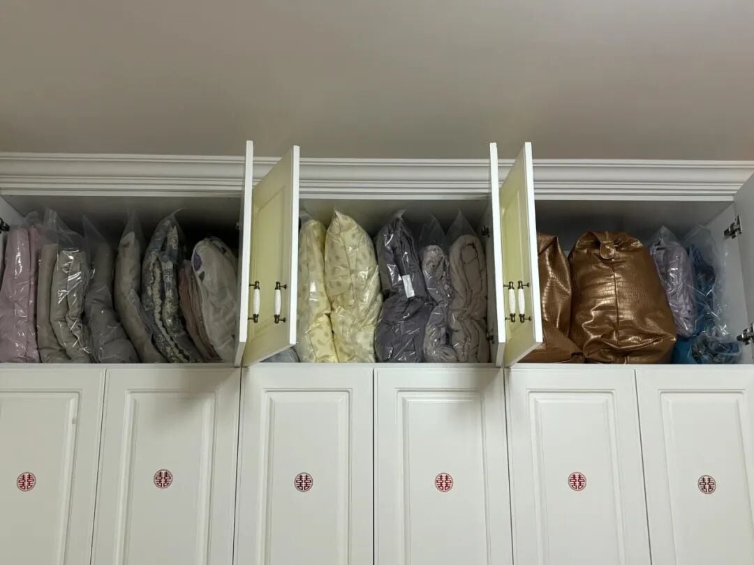 Gối là thứ chiếm diện tích khủng khiếp trong tủ. Thay vì nhồi nhét, các cô dì chọn túi hút chân không để nén gối bông lại.