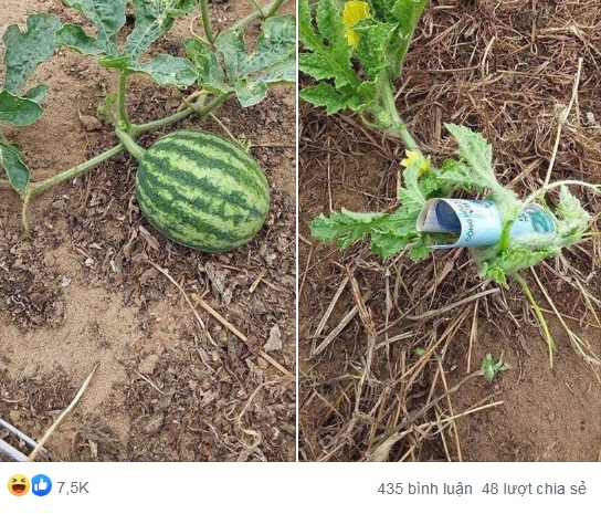 Quả dưa hấu từ màu xanh lá bỗng dưng "bốc hơi" khó hiểu và biến thành màu xanh của tờ 20.000 đồng gây khó hiểu cho gia chủ. Hãy tưởng tượng xem nếu một ngày đẹp trời bạn trồng và chăm sóc dưa hấu, mong nó lớn lên từng ngày để mình được dịp thưởng thức thế nhưng đùng một hôm... quả dưa biến mất và để lại trong bạn tờ 20.000 đồng cùng với sự thất vọng.