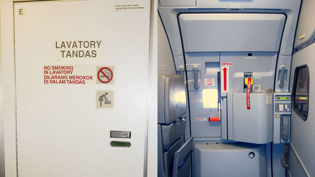 Cửa nhà vệ sinh (trái) có nhiều thông tin nhận biết bên ngoài như Toilet (Nhà vệ sinh), Lavatory Tandas (Nhà vệ sinh tiêu chuẩn). Còn cửa thoát hiểm (phải) thường có cảnh báo mũi tên đỏ hướng lên và mô phỏng hình của một ô cửa sổ bầu dục.