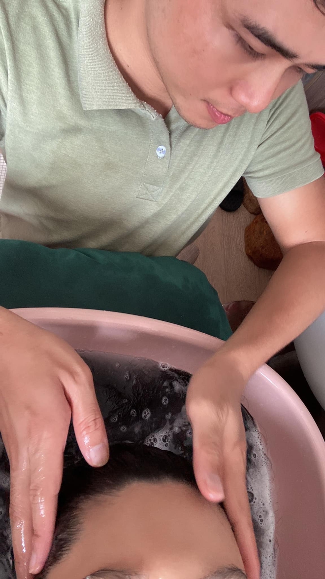 Bên cạnh đó, nhiều người cũng bày tỏ sự ngưỡng mộ bởi chàng trai không chân Tô Đình Khánh không chỉ chăm con khéo mà còn cực chiều vợ. Mới đây, Trần Thương đăng tải hình ảnh được ông xã gội đầu cho ngay tại nhà. Cô bày tỏ: “Khi yêu đúng người bạn sẽ hạnh phúc. Đúng là bao nhiêu mệt mỏi cũng tan biến”.