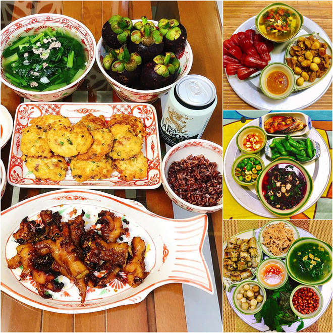Những mâm cơm được phối hợp màu sắc rất hài hòa, đẹp mắt, đầy đủ dinh dưỡng từ món mặn, món canh, rau đến hoa quả tráng miệng.