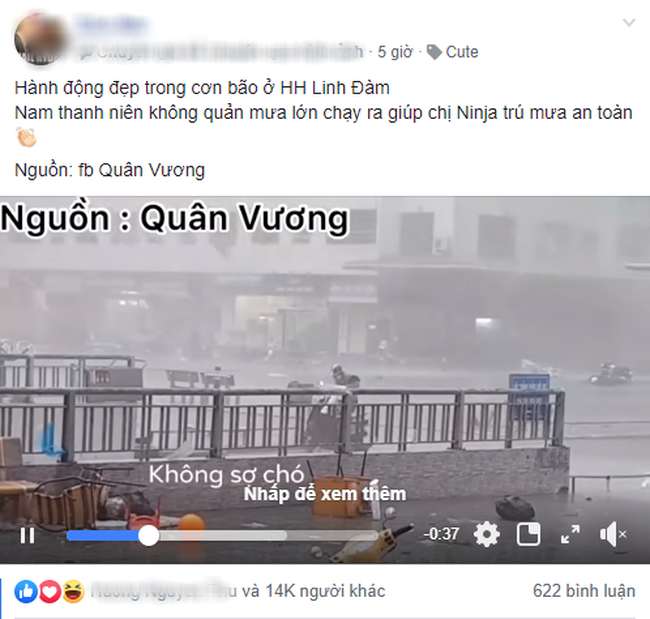 Hình ảnh này đã được một người dân sống tại KĐT Linh Đàm ghi nhận lại và đăng tải lên mạng xã hội cùng lời cảm thán: ''Hành động đẹp trong cơn bão ở HH Linh Đàm. Nam thanh niên không quản mưa lớn chạy ra giúp chị Ninja trú mưa an toàn!''.