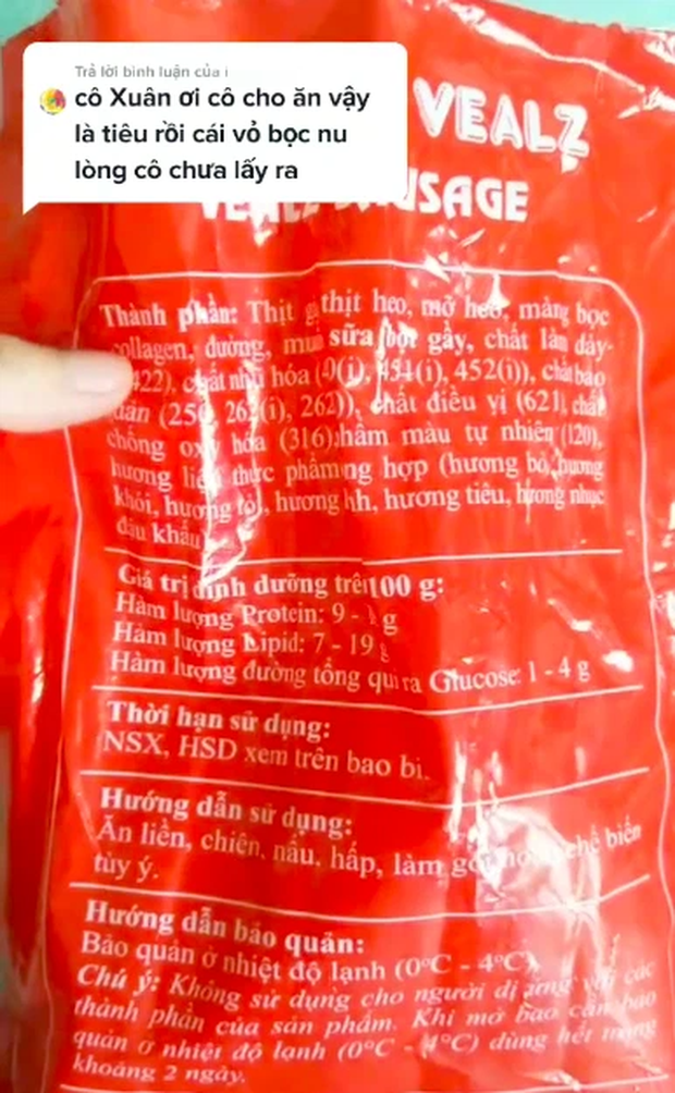 Chưa dừng lại ở đó, cô này còn cho biết đã lỡ chiên và sử dụng xúc xích rồi mới phát hiện bao ny-lông.