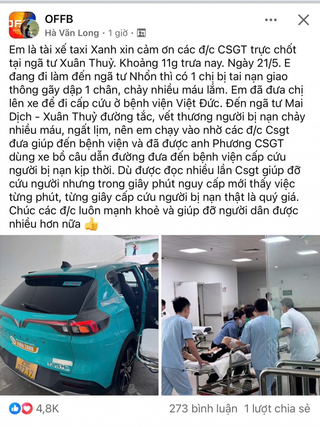 Sau đó, lái xe taxi đã chia sẻ lại câu chuyện xúc động này lên mạng xã hội, bày tỏ lòng cảm kích trước tinh thần trách nhiệm, sự hỗ trợ tận tình, nhanh chóng của lực lượng CSGT. Hành động cao đẹp, đầy trách nhiệm của lực lượng CSGT và người lái xe đã nhận được nhiều lời khen ngợi, lan tỏa mạnh mẽ trên mạng xã hội.