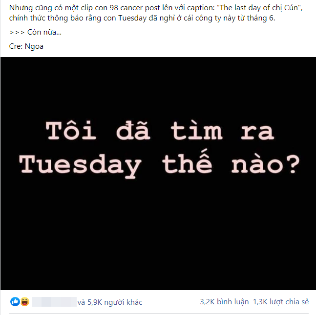 "Nhưng cũng có một clip con 1998 post lên với caption: 'The last day of chị Cún', chính thức thông báo rằng con kia đã nghỉ ở cái công ty này từ tháng 6".