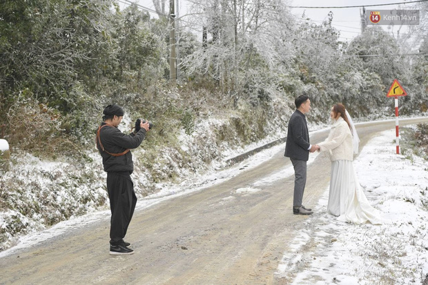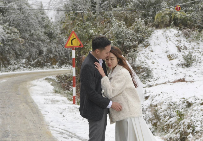 Sáng 11/1, chúng tôi gặp gỡ cô dâu Linh và chú rể Thương đang cùng ekip thực hiện bộ ảnh cưới rất đặc biệt giữa trời tuyết trắng xóa tại Y Tý. Cặp đôi đều đến từ Hà Nội, may mắn đến kịp với Y Tý và bắt trọn không gian tuyết phủ trắng đẹp lộng lẫy như "trời Âu".