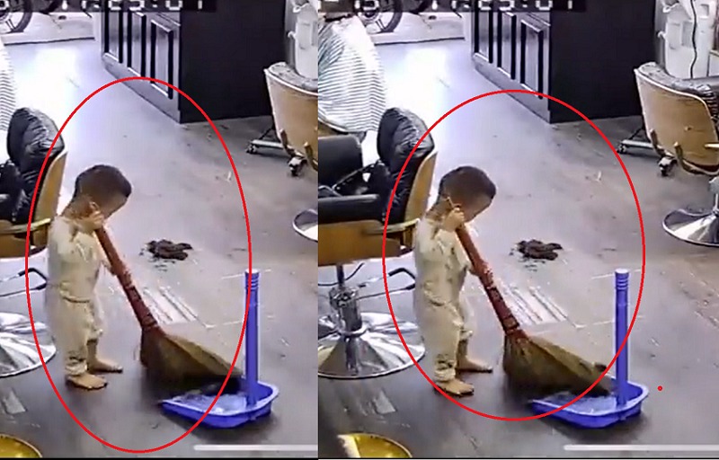 Cụ thể, trong khi người bố đang chăm chú cắt tóc cho khách, bé trai dùng hai tay cầm chổi cao hơn mình đi quét dọn sạch sẽ từng góc nhà. Sau khi dồn tóc vụn vương vãi khắp nơi vào một chỗ, cậu bé còn quét gọn vào cái xúc rác để mang đi.