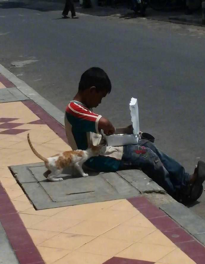 Điều đáng chú ý hơn cả là hành động của cậu bé với chú mèo bên cạnh. Em nhường một phần đồ ăn của mình cho mèo con, còn nhẹ nhàng xoa đầu nó. Không phải ai cũng hào phóng như em.