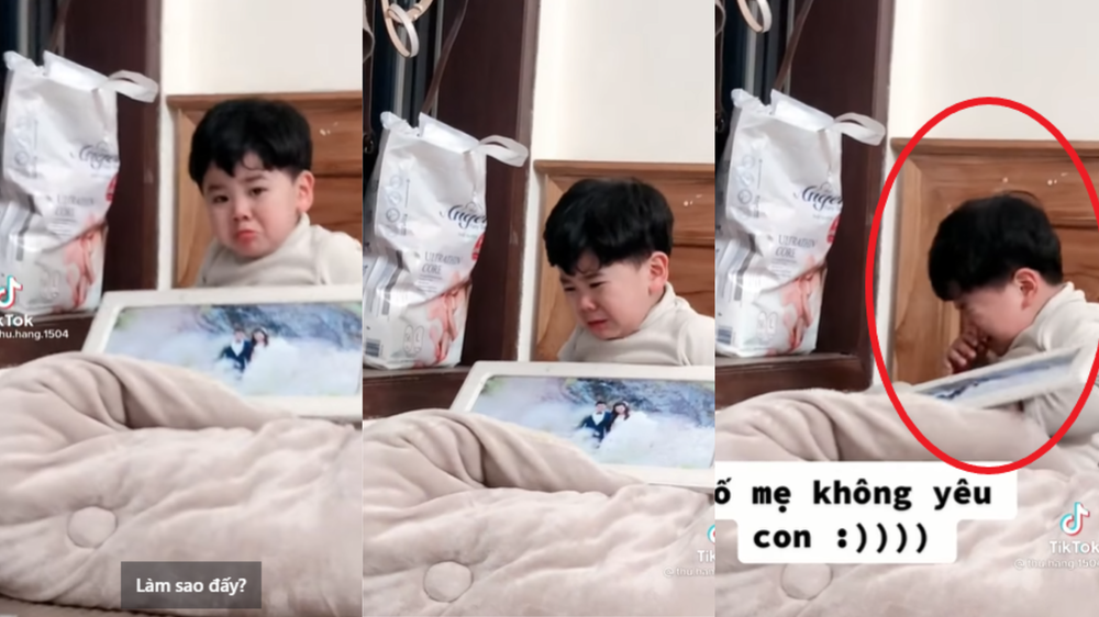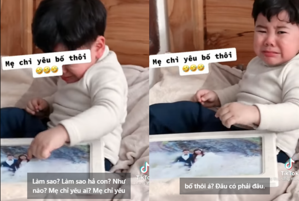 Trong clip, cậu bé ôm tấm ảnh cưới của bố mẹ, mếu máo vừa khóc vừa nói: “Bố mẹ không yêu con. Mẹ chỉ yêu bố thôi”. Người mẹ trêu chọc cậu bé: “Cú sốc đầu đời của thanh niên lần đầu phát hiện mình không có mặt trong ảnh cưới của bố mẹ.”