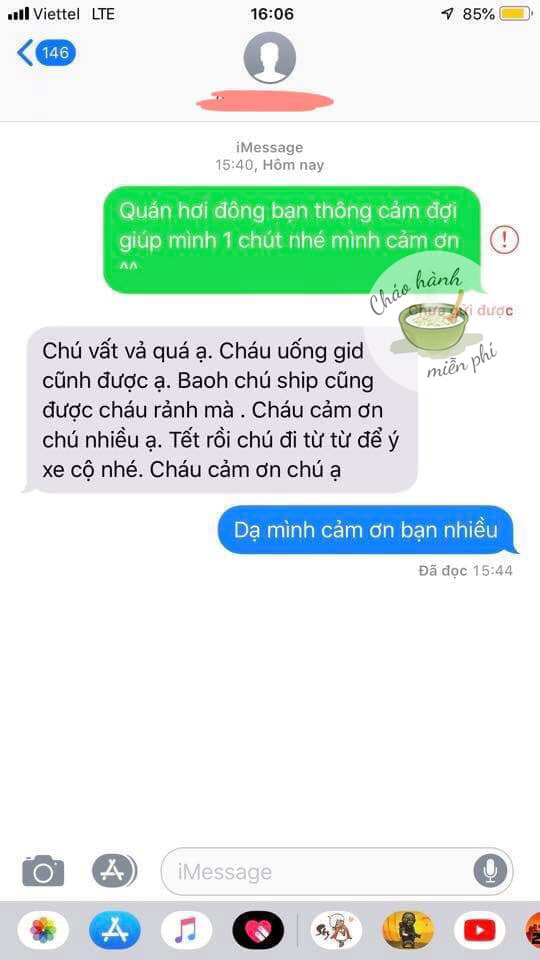 Ngay cả cách trả lời tin nhắn của shipper khi phải đổi món cũng rất lịch sự, lễ phép và khiến tất cả phải cảm động: "Chú vất vả quá ạ. Cháu uống gì cũng được. Bao giờ chú ship cũng được cháu rảnh mà. Cháu cảm ơn chú nhiều ạ. Tết rồi chú đi từ từ để ý xe cộ nhé. Cháu cảm ơn chú ạ".