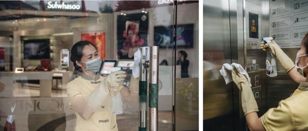 "Có những ngày TTTM không tấp nập như mọi khi nhưng không vì thế mà tôi cho phép mình được nghỉ ngơi. Việc của tôi là khử trùng toàn bộ các bề mặt tiếp xúc tại TTTM 2 tiếng/lần nên hầu như cả tổ House Keeping (HK) không lúc nào ngơi tay. Toàn bộ các tay vịn thang cuốn, nút bấm thang máy, khu vực WC đều phải đảm bảo được sát khuẩn để hạn chế nguy cơ lây nhiễm viruts cho khách", chị Bùi Thị Liên, bộ phận HK, tại Vincom Center Bà Triệu chia sẻ.
