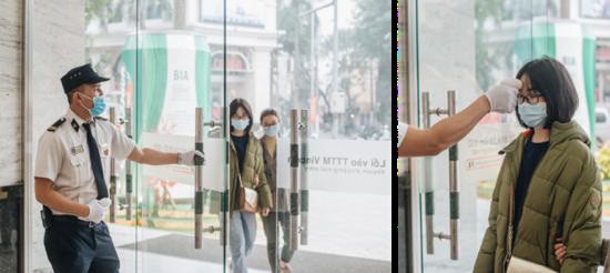 Khuôn mặt vẫn còn hằn lên những vết do phải đeo khẩu trang cả ngày, anh Nguyễn Văn Tú, nhân viên bảo vệ tại đây chia sẻ: "Mình không thấy vất vả vì tuy hành động của mình nhỏ bé nhưng sẽ phần nào giúp bảo vệ được khách hàng đến mua sắm trong TTTM". Công việc hàng ngày của anh là mở cửa và đo nhiệt độ của khách hàng. Bởi lẽ đó, có bao nhiêu khách đến với TTTM thì anh gần như là người đầu tiên tiếp xúc. Tuy nhiên, tính chất công việc không vì thế mà khiến anh lo lắng, sợ hãi.