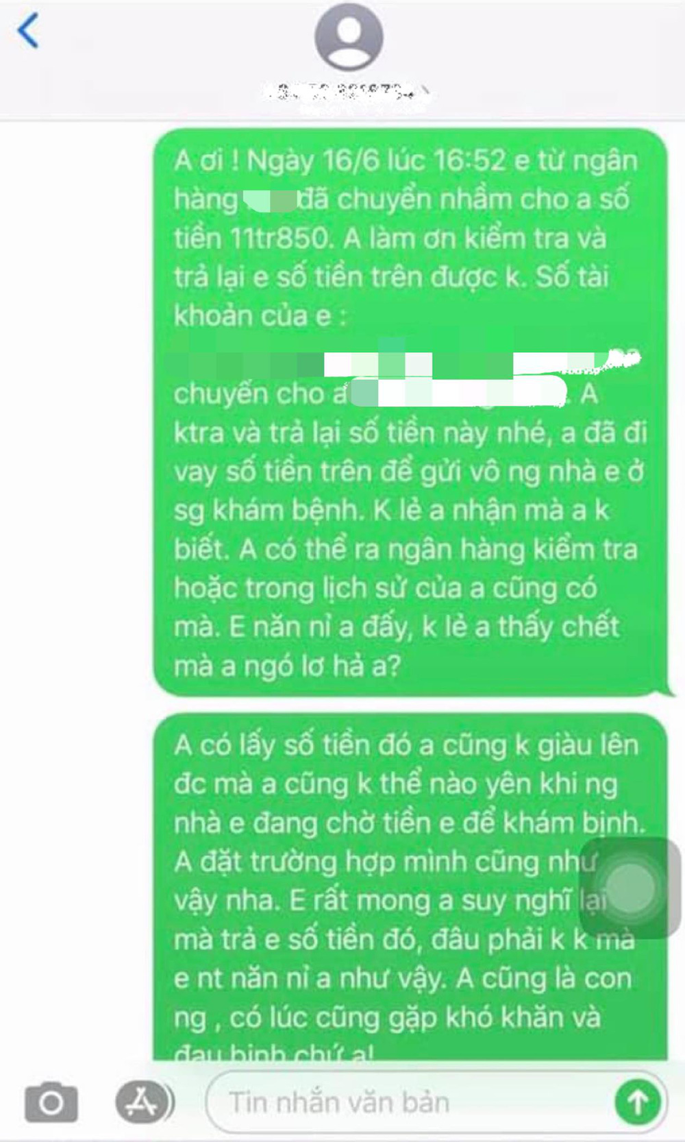 "Anh ơi! Ngày 16/6 lúc 16h52 em từ ngân hàng XX đã chuyển nhầm cho anh số tiền 11 triệu 850 nghìn đồng. Anh làm ơn kiểm tra và trả lại số tiền trên được không? Số tài khoản của em 555.55xxxx. Anh kiểm tra và trả lại số tiền này nhé, em đã đi vay số tiền trên để gửi cho người nhà ở Sài Gòn khám bệnh, không lẽ anh nhận mà anh không biết. Anh có thể ra ngân hàng kiểm tra hoặc trong lịch sử của anh cũng có mà. Em năn nỉ anh đấy, không lẽ anh thấy chết mà anh ngó lơ hả anh?".