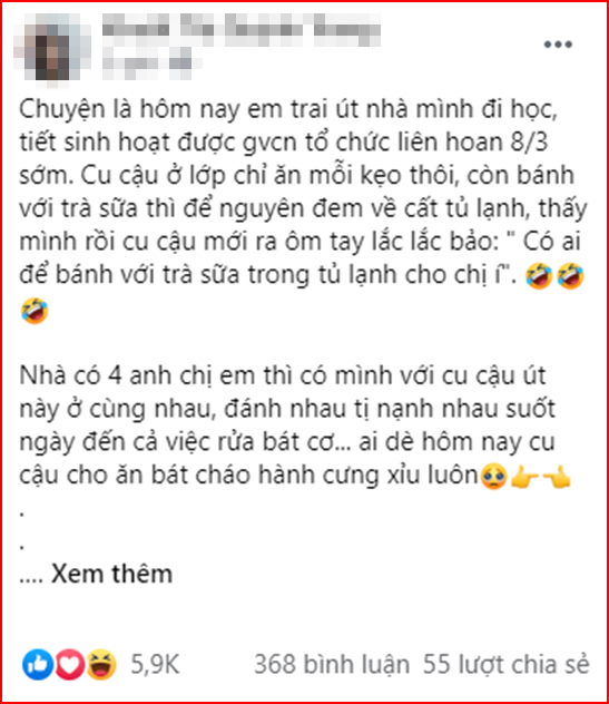 Cô cho biết, em trai út đi học ở trường và trong trường tổ chức liên hoan mừng ngày 8/3 sớm. Tuy nhiên, cậu bé lại chỉ ăn kẹo và để hẳn phần bánh và trà sữa lại cho chị gái của mình.