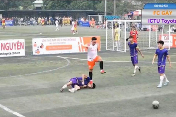 Lúc này, cầu thủ số 14 của FC GẨY liền dùng chân trái đá thẳng vào chân đối phương từ phía sau khiến cầu thủ đội bạn nằm lăn trên sân vì đau đớn. Chưa dừng lại, cầu thủ số 14 này còn giẫm lên mặt đối thủ đang nằm trên sân khiến anh này lên cơn co giật.