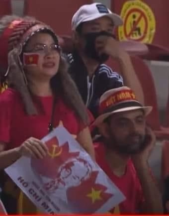 Bên cạnh sự hân hoan vui sướng là một người đàn ông mang đậm nét Tây Á, nhưng lại mặc áo cờ đỏ sao vàng với vẻ mặt buồn thiu, chán nản. Trông anh ta vô cùng lạc lõng giữa dàn cổ động viên đang "cháy" hết mình kia.