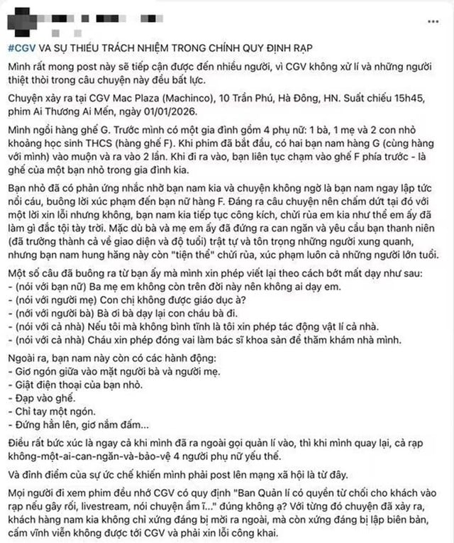 Theo nội dung chia sẻ, sự việc xảy ra trong suất chiếu chiều 1/1/2026. Gia đình gồm bốn người, có người cao tuổi và hai trẻ chưa đủ 18 tuổi, đang theo dõi phim thì xảy ra mâu thuẫn với hai nam thanh niên ngồi phía sau.