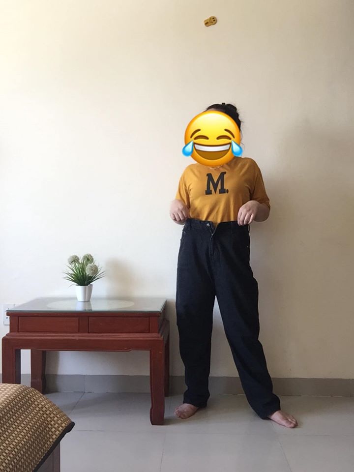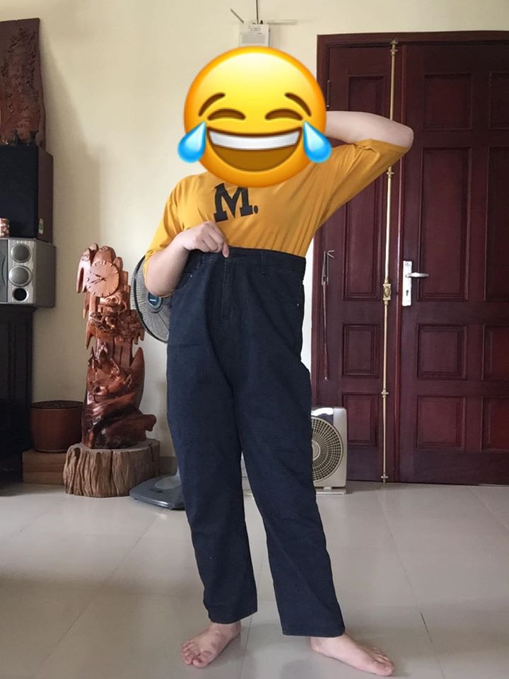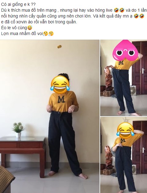 Ưng quá, M.đã quyết định mua chiếc quần đó nhưng ai ngờ khi nhận hàng thì chiếc quần quá to lớn đến nỗi M. có thể kéo lên đến nách. "Em đã cố sơ vin áo vào rồi nhưng vẫn bơi trong quần mọi người ạ. Thả tay ra thì tuột không trật phát nào. Éo le vô cùng, lợn mua nhầm đồ của voi" - M. mếu máo chia sẻ.