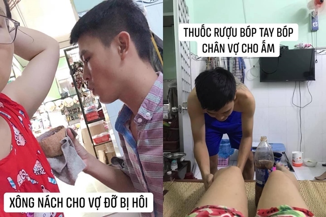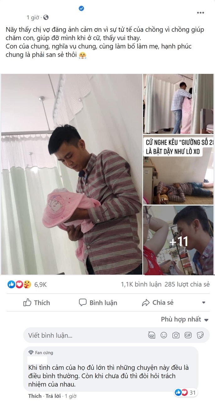 Theo một bài đăng trên mạng xã hội, cô gái cho biết bản thân vừa sinh xong. Nhưng may mắn cho cô, người chồng luôn túc trực chăm sóc bên cạnh, không nề hà bất kỳ việc gì kể cả giặt đồ, xông nách vợ, cho con bú... Nội dung bài đăng của cô như sau: "Nãy thấy chị vợ đăng ảnh cảm ơn vì sự tử tế của chồng vì chồng giúp chăm con, giúp đỡ mình khi ở cữ, thấy vui thay. Con của chung, nghĩa vụ chung, cùng làm bố làm mẹ, hạnh phúc chung là phải san sẻ thôi".