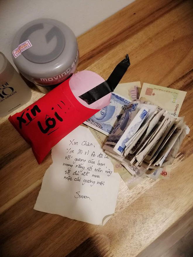 "Xin chào, xin lỗi vì tô đã lam vỡ gưong cúa bạn, mong rằng số tiên này sẽ đủ để mua một cái gương mới.