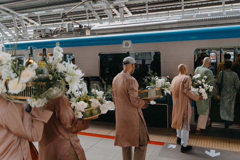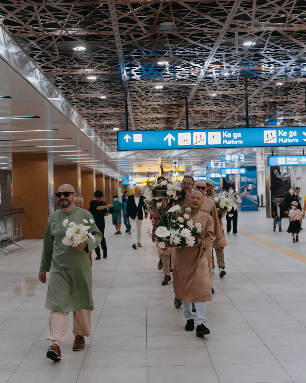 Sáng 12/4, chú rể cùng đoàn nhà trai đi bộ đến ga Thảo Điền, rồi lên tàu điện và di chuyển đến ga Nhà hát Thành phố (quận 1).