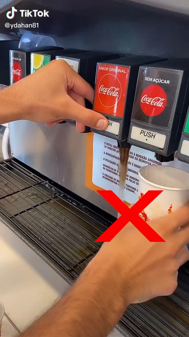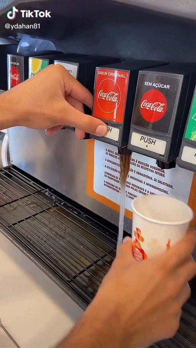 Tuy nhiên, nếu khách hàng nào cũng làm theo đúng quy định thì sẽ chẳng có gì xảy ra, thế nhưng mới đây, một anh chàng lại khoe cách lấy nước ngọt có ga ở máy sao cho có lợi nhất. Cụ thể, người này bấm nút cho nước chảy và liên tục đưa cốc vào rồi lại rút ra. Có thể thấy, ở phần nước chảy ra sẽ có màu nâu và trắng xen kẽ. Người này cho rằng phần màu trắng là nước lọc và làm vậy để lấy được nước "đặc" hơn.