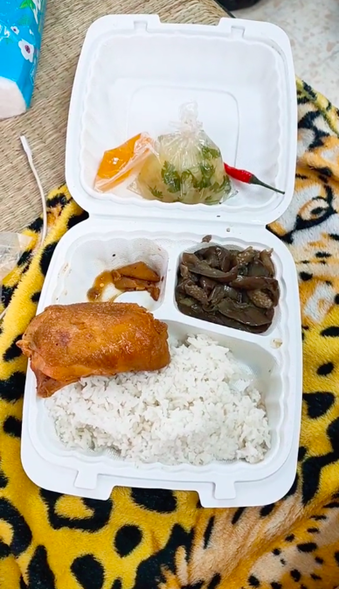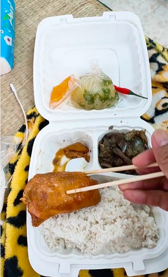 Trong video, chàng trai khoe một hộp cơm mà mình được ăn trong khu cách ly tập trung. Khẩu phần dành cho 1 người gồm miếng thịt gà khá to, cà tím, canh và gia vị. Theo lời anh chia sẻ, phần ăn thế này là rất nhiều. "Mấy cái con nói không có nhiều đồ ăn là nói xạo không đó nha!" - anh chia sẻ.
