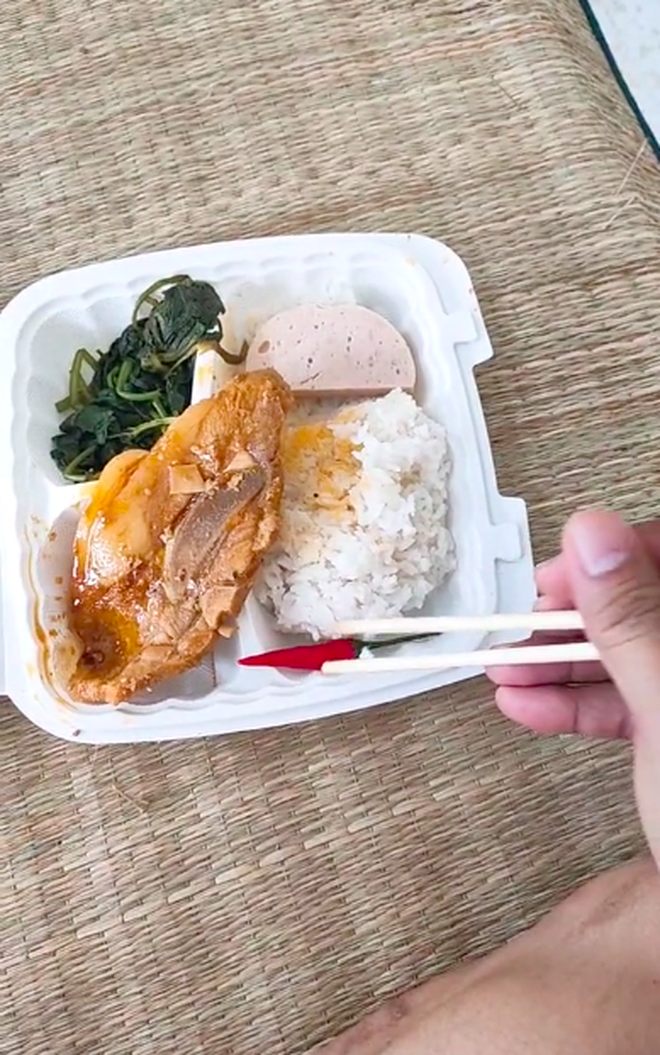Trong một đoạn clip khác, người đàn ông này tiếp tục khoe phần cơm trong khu cách ly với chả lụa, rau muống và một miếng sườn khá dày.