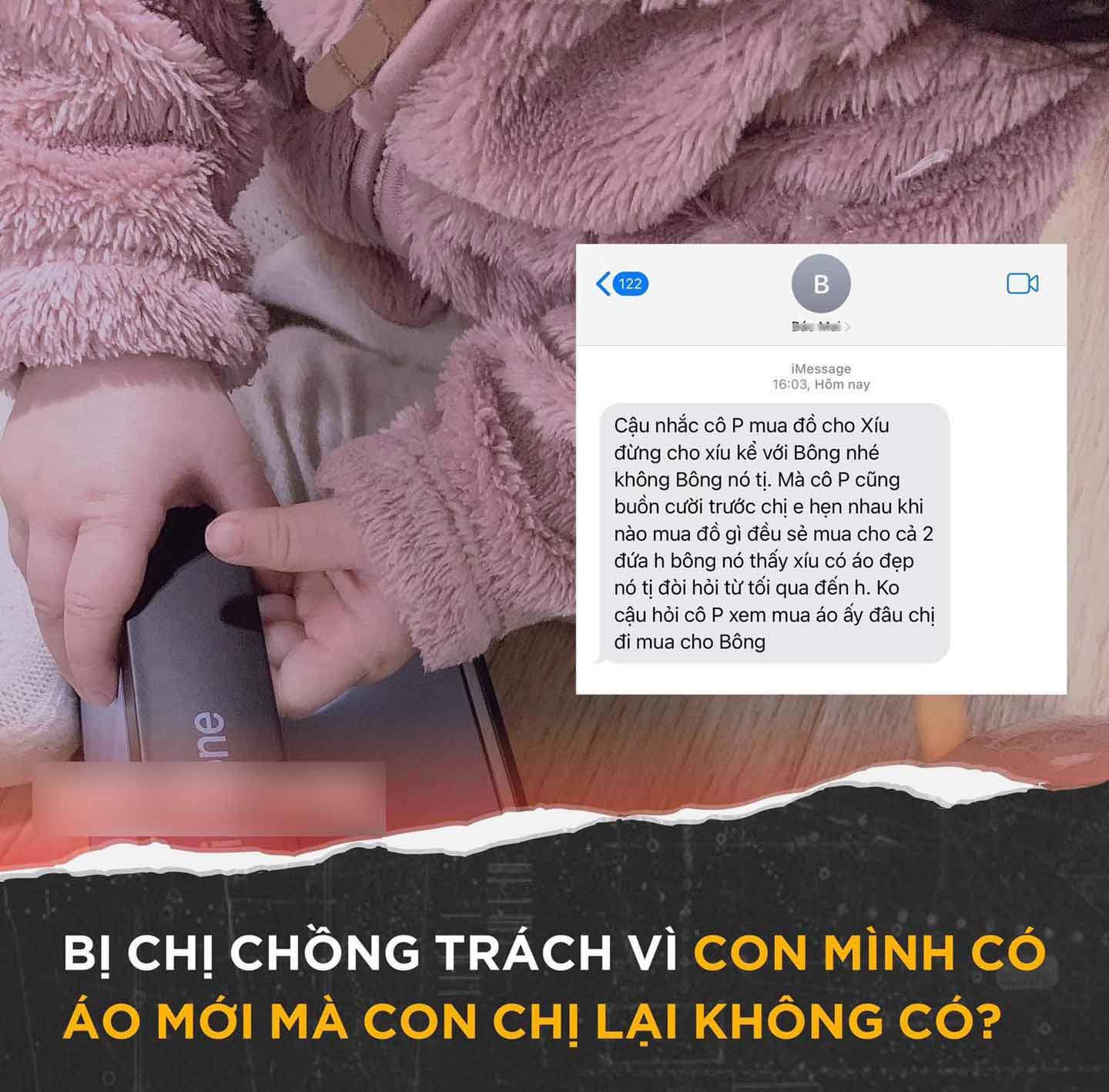 Từ lần đó, chị gái chồng mới hẹn với mình là từ giờ cả chị và mình mua gì cho con đều sẽ mua cho đứa còn lại. Thế nhưng thực chất chị cũng chỉ tặng con mình 1 chiếc áo khoác gió còn lại là toàn đồ ăn kiểu bim bim bánh kẹo. Có lần mình thấy con bé nhà chị và khen 1 câu "B hôm nay xinh nhỉ", con bé định nói gì đấy rồi lại bảo "À..thôi, mẹ cháu dặn không được nói"
