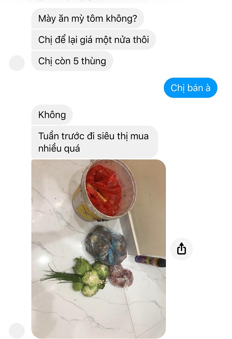Theo đó, phụ nữ kia đang gạ bán mì tôm của nhà chị ta với "giá hời", chỉ bằng 1 nửa giá thị trường. Cô cũng than thở rằng cả nhà đã ngán ăn mì, mà số lượng lại còn nhiều quá.