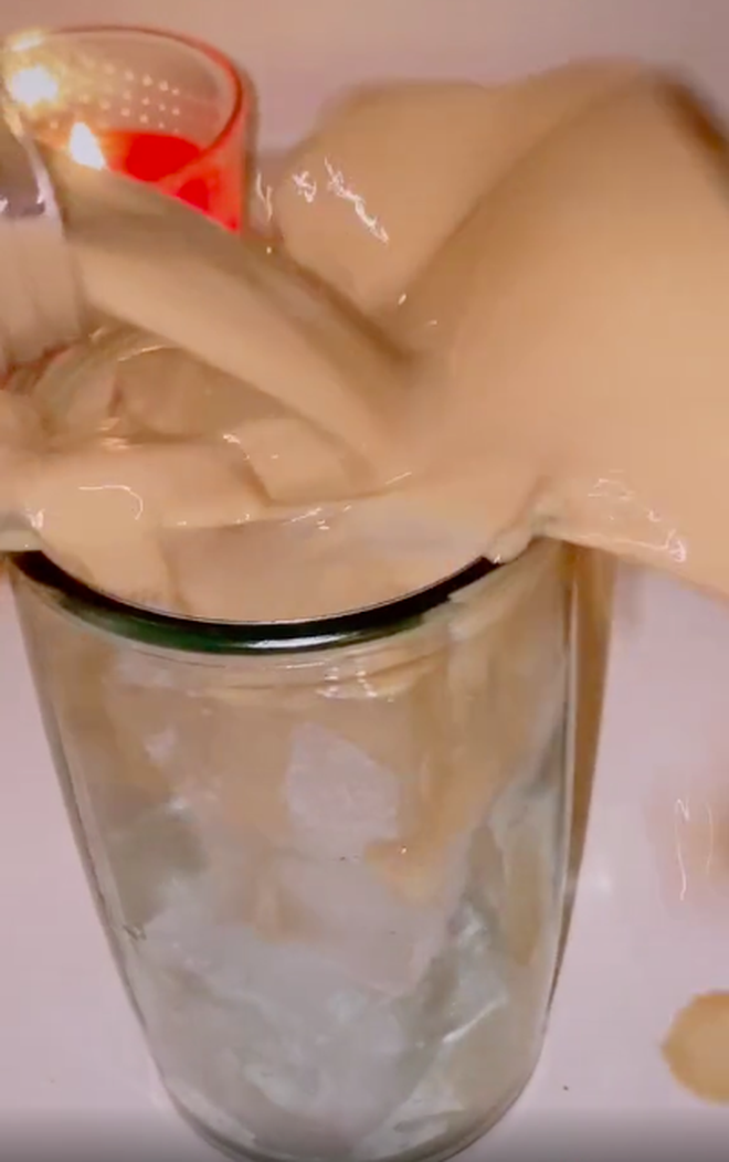 Cũng như bao người khác, cô gái này có thói quen pha cà phê uống vào mỗi buổi sáng để bắt đầu ngày mới thật tỉnh táo. Sau khi lấy đá viên ra khỏi tủ lạnh và lấp đầy vào chiếc ly nhỏ, cô ta đổ cà phê từ trong một chiếc chai vào ly.